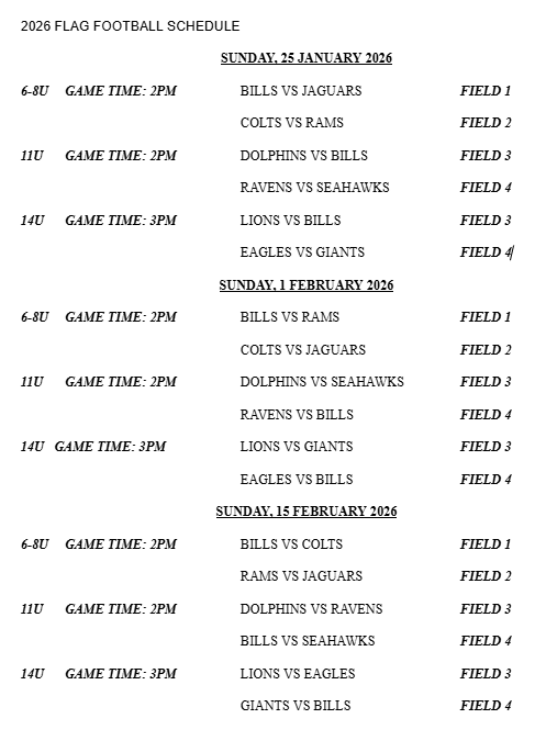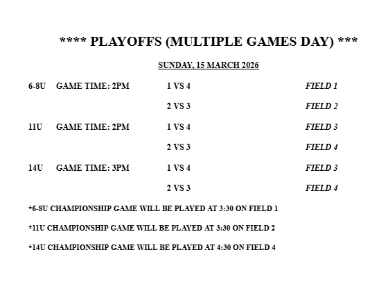 • Games and practices will begin on 1/18/26 through 3/29/26 on Sunday afternoons.